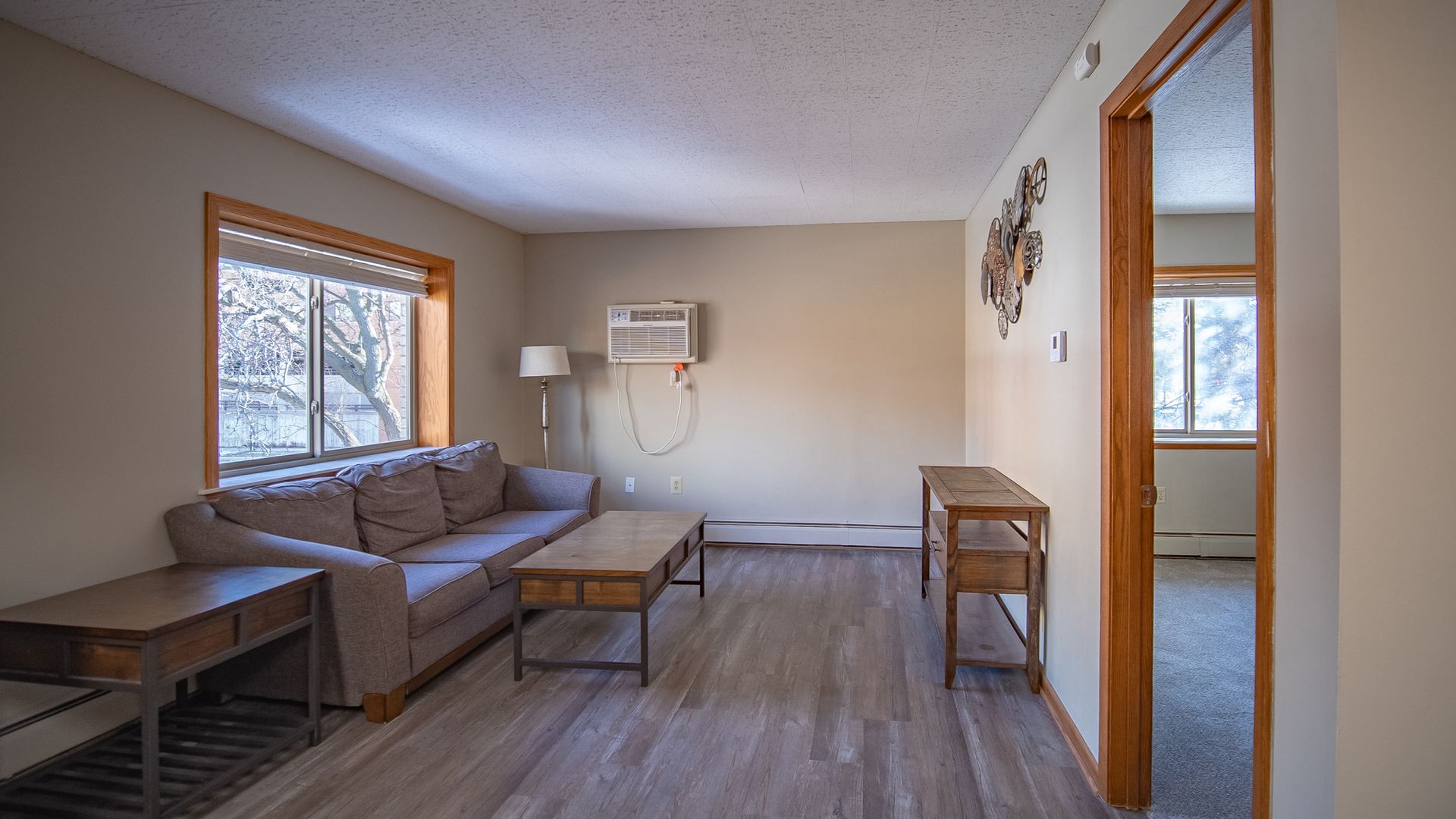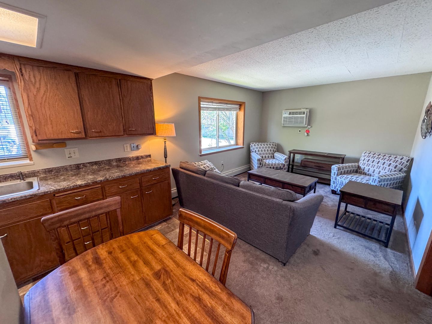 This semi-furnished unit offers a cozy feel right when you enter with an open main living area surrounded with windows for natural light. This apartment offers spacious closet space. With that being said, laundry will be a breeze. With the coin-operated laundry machine in the building, you can say goodbye to laundromats.
